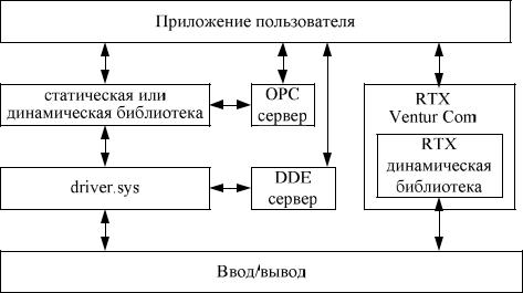 DDE, OPC-компоненты являются серверами по отношению к SCADA-системам. По отношению к ПО нижнего уровня (fieldbus) возможна организация Master/Slave и Client/Server. Внешние устройства способны посылать и принимать данные через плату. Когда вставная в персональный компьютер плата является Master/Client, то именно плата с поддерживаемым ПО является инициатором опроса промышленных устройств. В случае применения плат типа Slave/Server они реагируют на запросы внешних устройств. На некоторых вставных платах имеется разделяемая область памяти. Эта память доступна как приложению в ПК, так и встраиваемому ПО. На рис. 8 показана обобщенная схема организации коммуникационного ПО для Windows NT. На предлагаемой схеме отражены как традиционные решения на базе стандартных Windows NT-драйверов, так и с использованием библиотек, реализованных в расширении реального времени RTX от VenturCom.