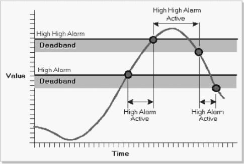 Из рис. 9 видно, что алармы Hi и HiHi срабатывают при достижении переменной заданных для каждого аларма пределов (High Alarm, High High Alarm). Для выхода переменной из состояния аларма (HiHi или Hi) необходимо, чтобы ее значение стало меньше порогового на величину, называемую зоной нечувствительности (Deadband). Аналогично можно интерпретировать алармы типов Lo и LoLo.