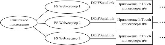 На рис. 20 показаны возможности разработки Internet-приложений и запуск их в реальном времен на примере SCADA-системы InTouch. Причем следует отметить, что процедура публикации (publishing) SCADA-приложений является дружественной и не требует специальной подготовки и знания специфических языков программирования и выполняется, как правило, с помощью специальных средств SCADAсистемы «нажатием одной кнопки». Навигатор Microsoft Internet Explorer (MIE) или исполняющая система InTouch могут использоваться для просмотра приложения Web-клиентом. Интернет-приложение позволяет собирать данные с многих FS Web-серверов (рис. 21). В таких случаях каждый Web Server адресуется специально именем или IPадресом. Чтобы подписаться на приложение, необходимо загрузить его из текущего FS Web-сервера и выделить его в локальную директорию на клиентской машине.