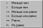 Для вызова меню символов операций сравнения следует нажать кнопку Условные диалоговой панели Редактор выражений. Результатом выражений сравнения является булево значение (0 или 1).