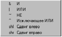 Для вызова меню символов битовых операций следует нажать кнопку Битовые диалоговой панели Редактор выражений.