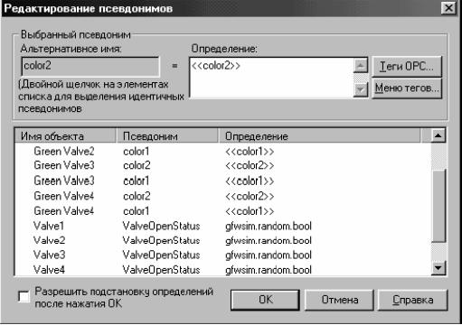Имеется возможность выделения множества элементов списка и одновременного определения для всех выделенных псевдонимов одного источника данных. Для выделения нескольких одинаковых альтернативных имен следует выполнить двойной щелчок левой клавишей мыши на имени объекта, связанного с одним из них. Флажок Разрешить подстановку определений после нажатия OK в отмеченном состоянии приводит к тому, что подстановка определений псевдонимов выполняется сразу после нажатия кнопки OK диалоговой панели. В противном случае подстановка выполняется только после перевода GraphWorX32 в