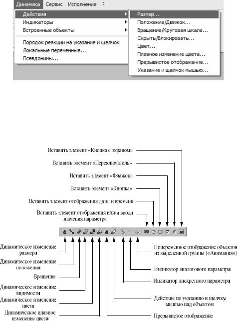 Динамические действия позволяют изменять визуальные свойства графического объекта, к которому они применены, в зависимости от значений тегов OPC, имена которых содержатся в полях Источник данных соответствующих страниц Инспектора свойств объекта. Внешний вид подменю Действия меню Динамика показан на рис. 49.