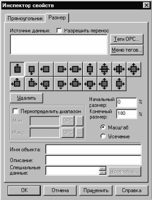 На экран монитора будет выведена диалоговая панель Инспектор свойств с выбранной страницей Размер, внешний вид которой показан на рис. 51. Введите имя тега, локальной переменной или псевдонима в поле Источник данных или воспользуйтесь кнопками Теги OPC или Меню тегов для указания имени источника данных. Выберите тип изменения размера нажатием кнопки с изображением способа изменения размера.