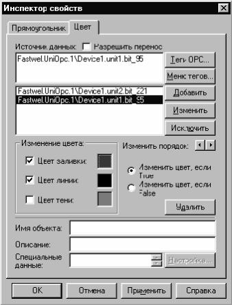 Для установления динамического соединения Цвет выделите объект. Выберите строку Цвет подменю Действия меню Динамика или нажмите кнопку Цвет набора инструментов Динамика. На экран монитора будет выведена диалоговая панель Инспектор свойств с выбранной страницей Цвет (см. рис. 55). Введите имя тега, локальной переменной или псевдоним в поле Источник данных или воспользуйтесь кнопками Теги OPC или Меню тегов для указания имени источника данных. Следует использовать источники данных с булевыми значениями.