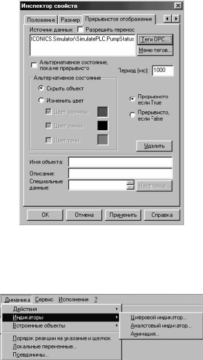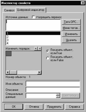 ) позволяет связывать отдельные графические объекты из объединенных в группу с соответствующими источниками данных, имеющими булев тип. В режиме Исполнение переход значения связанного источника данных в состояние ИСТИНА (True) (или ЛОЖЬ (False)) приводит к появлению соответствующего графического объекта на экране. В каждый момент времени может отображаться только один графический объект из нескольких, связанных с одним и тем же источ-