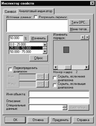 вместе своего создания в рабочей области экранной формы, когда значение связанного источника данных находится в пределах выбранного поддиапазона. При этом остальные объекты группы не отображаются. Переход значения источника данных в другой поддиапазон приводит к скрытию ранее отображаемого объекта и включению отображения другого графического объекта группы, которому соответствует текущий поддиапазон. Количество поддиапазонов равно количеству графических объектов в группе. Единицы измерения в поддиапазонах – проценты от полной шкалы значения связанного источника данных.