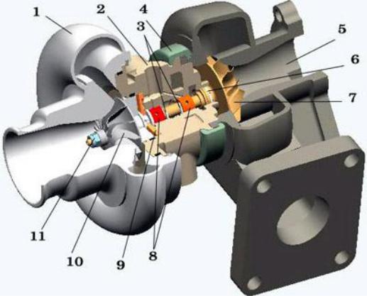 8 – подшипники скольжения; 9 – упорный (аксиальный) подшипник; 10 – колесо компрессора; 11 – гайка крепления колеса компрессора