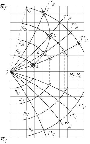 соответствуют таким режимам работы турбины и компрессора, когда их мощности равны. Соединяя полученные точки А, Б, В, Г, получают линию рабочих режимов турбокомпрессора, характеризующую изменение параметров наддува при любых значениях частот вращения и температур выпускных газов перед турбиной. Поле КПД компрессора специально не изображено для лучшего понимания построения линии рабочих режимов турбокомпрессора. Следует отметить, что работа компрессора должна проходить в зоне его максимального КПД и допустимой температуры перед турбиной. Линия рабочих режимов турбокомпрессора должна быть расположена на достаточном удалении от границы помпажа (вредных автоколебаний воздушного потока в каналах компрессора).