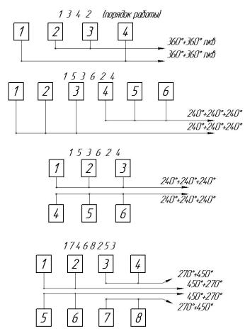 Рис. П.3. Примеры разделения выпускных трубопроводов и объединения их в группы при импульсной системе наддува