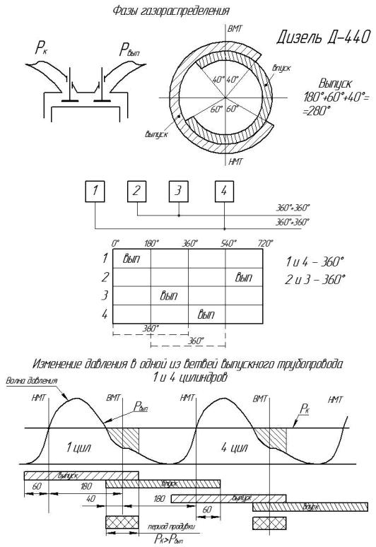 вает (рис. П.4), что период выпуска составляет 280о. Между первым и четвертым, а также вторым и третьим цилиндрами процесс выпуска отработавших газов составляет 360о (см. таблицу на рис. П.4). Если объединить первый и четвертый выпускные патрубки первого и четвертого цилиндров, а также второго и третьего цилиндров, то импульсы давления, создаваемые на выпуске, без изменения дойдут до турбины. На рис. П.4 показаны импульсы волны давления на выпуске первого и четвертого цилиндров Рвып. До периода продувки величина давления выпускных газов Рвып превышает значение давления наддува Рк. Когда впускной и выпускной клапаны открыты (продувка), то
