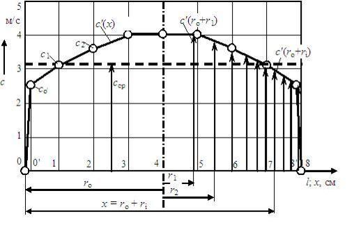 График скоростей c'(x) в виде ломаной кривой и опытные значения скоростей (обозначены кружочками) показаны на рис. 1.4.