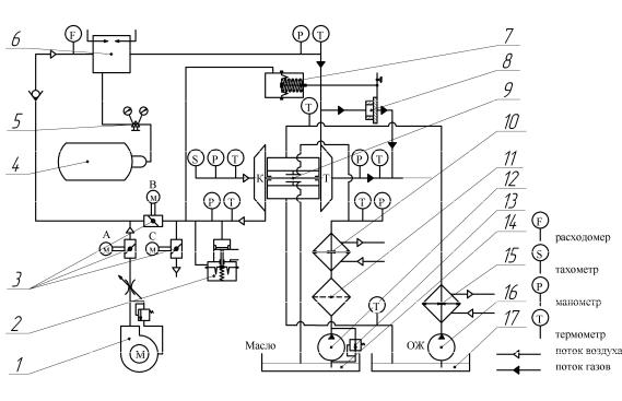 На рис. 2.1 приведена схема рекомендуемого стенда, позволяющая проводить диагностику и испытание турбокомпрессоров с ради- ально-осевой турбиной бензиновых и дизельных быстроходных двигателей мощностью до 360 кВт.