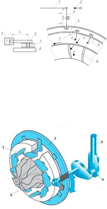 1 – лопатки соплового аппарата; 2 – диск поворотный; 3 – шток; 4 – рычаг управления; 5 – колесо турбины