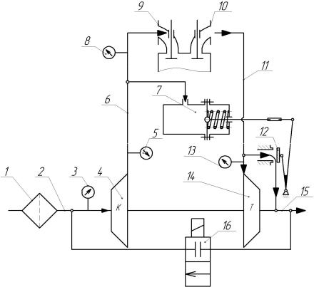 9 – впускной коллектор; 10 – выпускной коллектор; 11 – канал подвода газа к турбине; 12 – заслонка перепускного отверстия; 13 – манометр; 14 – турбина; 15 – выпускная система; 16 – клапан рециркуляции