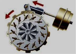 Пневматическая камера имеет мембрану, которой противодействует пружина. При давлении на выходе из компрессора больше требуемого усилие на мембране становится больше силы пружины. В этом случае шток перемещается и через рычажный механизм поворачивает лопатки, изменяя направления потока газов.