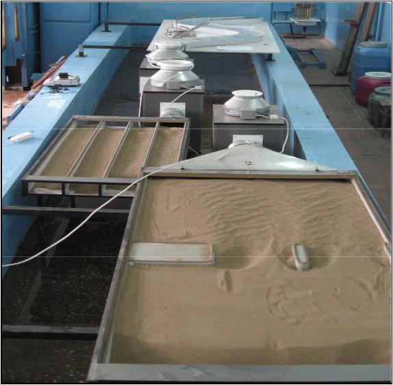 2) четыре лотка, наполненные песком разных фракций; 3) модель мостового перехода сбереговым устоем и опорами.