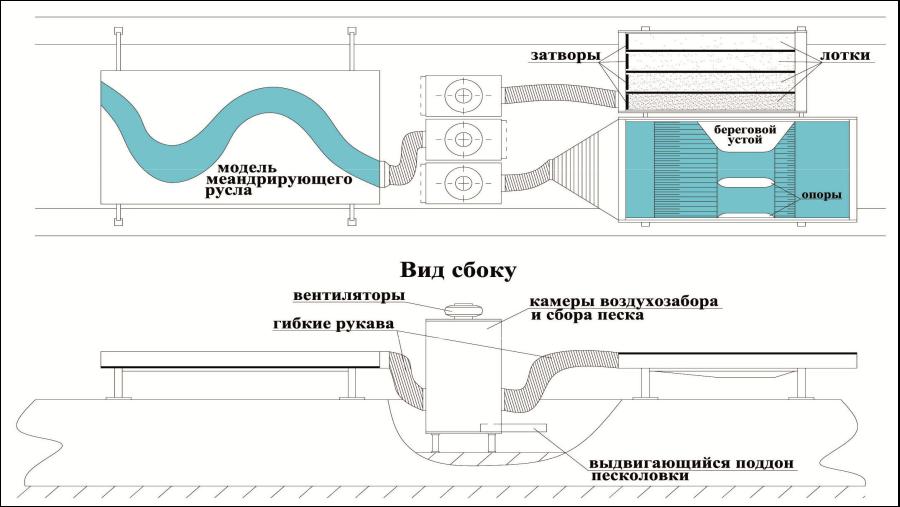 Рис. 2. Схема комплекса аэродинамических установок, включающегоИмодель меандрирующего русла, лотки с песком для определения транспортирующей способности потока и модель мостового перехода с береговым устоем