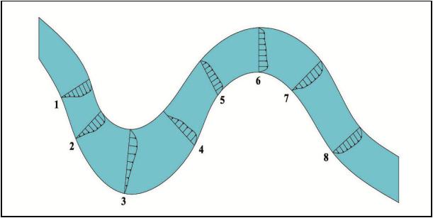 Рис. 9. План криволинейного участка русла с эпюрами средних продольных скоростей в створах