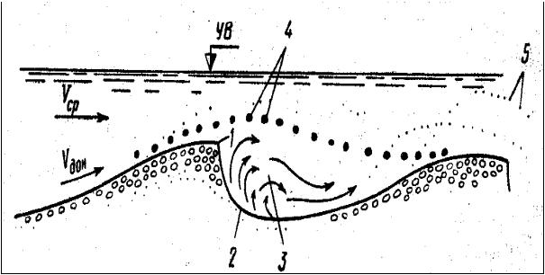 1 – гребень гряды; 2 – подвалье гряды; 3 – валец; 4 – частицы, перемещающиеся с грядами; 5 – частицы, переходящие