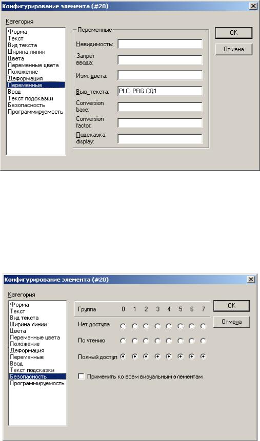CoDeSys, хотя такая возможность присутствует, и при конфигурировании переменных для отладочной визуализации необходимо обеспечить полный доступ всех групп пользователей к элементам отображения и управления, то есть проверить, чтобы в категории «Безопасность» радиокнопки групп «0»...«7» находились в положении «Полный доступ», можно применить этот выбор ко всем визуальным элементам (см. р сунок 37).