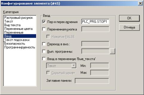 СКонф гур рован е кнопки происходит следующим образом: в окне «Конф гур рован е элемента...», выведенном для визуального элемента-кнопки вы рается вкладка «Ввод». Существует два режима работы кнопки: смена состояния по нажатию и смена состояния во