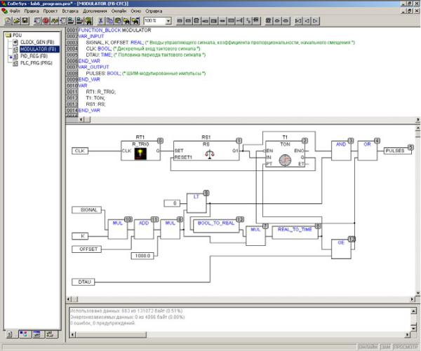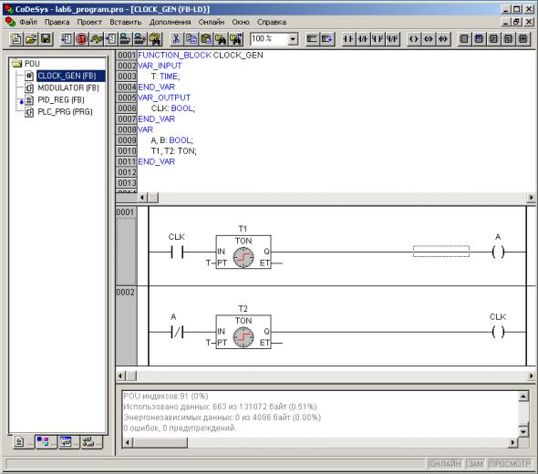 Генератор тактовых импульсов, представленный на рисунке 47, сокращен до двух строк кода и одной внутренней переменной, поскольку реализован в виде функционального блока, и все его переменные находятся в памяти. Переменная B, описанная на рисунке 47, не задействована. Время задается переменной типа TIME.