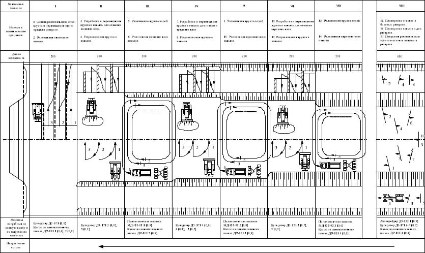 Рис. П.3.4. Технологический план потока по возведению насыпи земляного полотна автомобильных дорог |