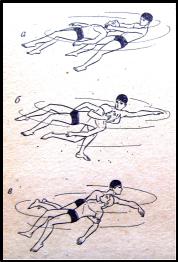 Наиболее эффективные способы транспортировки следующие: спасающий плывёт на спине с помощью движений одними ногами способом брасс или кроль, держа пострадавшего под мышки или охватив кистями рук его нижнюю челюсть (рис. 4, а). Руки спасателя должны быть выпрямлены так, чтобы лицо пострадавшего находилось над водой, а его тело не мешало выполнять движения ногами.