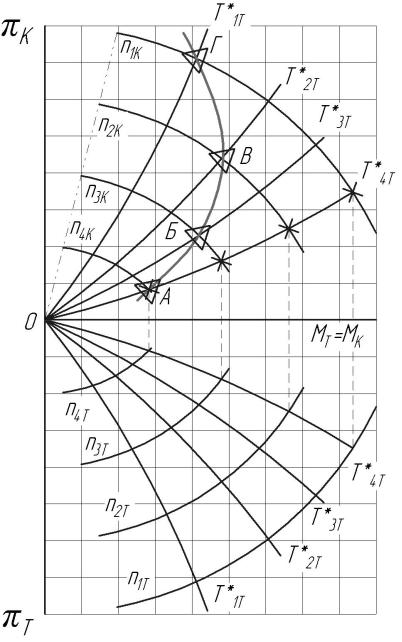 Рис. П. 2. Совмещенные характеристики турбины и компрессора