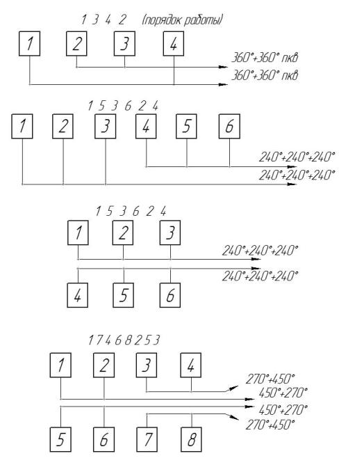 Рис. П.3. Примеры разделения выпускных трубопроводов и объединения их в группы при импульсной системе наддува