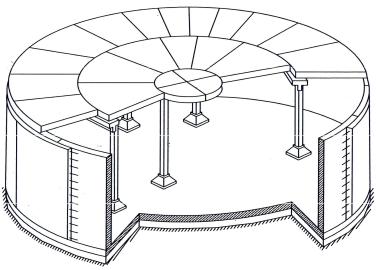 Чаще всего для цилиндрических резервуаров используются безбалочные перекрытия (рис. 3). Они могут быть монолитными или сборными. Безбалочные перекрытия имеют малую конструктивную высоту и гладкую поверхность, которая обеспечивает хорошую вентиляцию пространства над уровнем содержащейся воды.