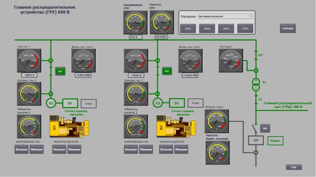 Регулируем параметры частоты и напряжения во вплывающем окне при попытке запуска одного из автоматических выключателей ДГ (QG1; QG2).