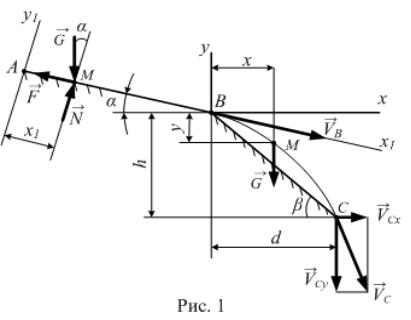Время движения точки М по участкуДВ составляет секунд. В конце участка АВ со скоростью VB материальная точка М покидает наклонную плоскость и начинает свободное движение поИвторому участку ВС. По истечении времени Т материальная точка ударяется о наклонную плоскость ВС, составляющую угол =45° с горизонтом. При движении