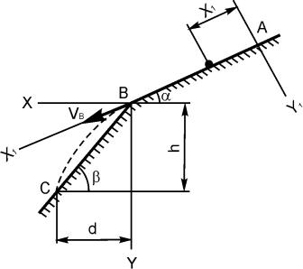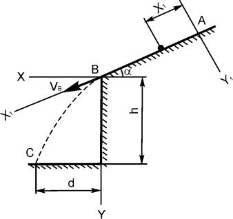 Тело скользит в течение τ секунд по участку АВ откоса, составляющему угол α с горизонтом и имеющему длину l. Его начальная скорость VA. Коэффициент трения скольжения тела по откосу равен f. Имея в точке В скорость VB , тело через Т секунд ударяется в точке С о