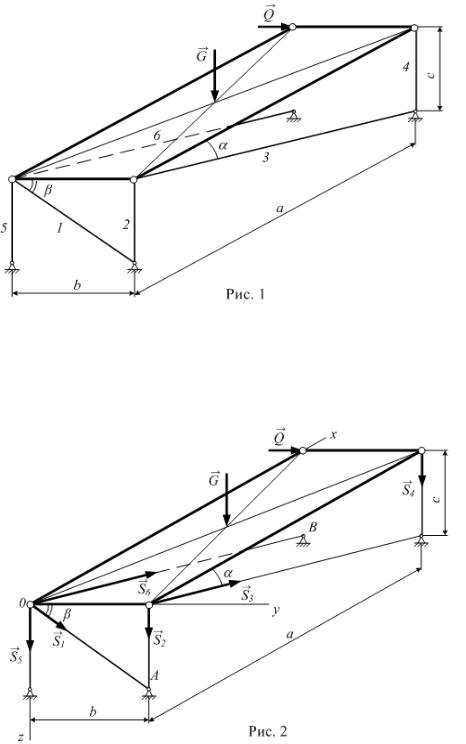 Плита крепится к основанию с помощью шести прямолинейных невесомых стержней, на концах которых имеются шаровые шарниры. Известны силы Q=35 кН; G=32 кН; размеры а=4 м; b=2 м; с=2 м.