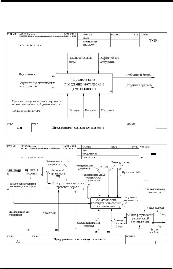 -разработка функциональных моделей, соответствующих предпринимательской деятельности, на первом этапе работ на глубину двух иерархических уровней: А-0 (ТОРдиаграмма) и А0 (первая декомпозиция);