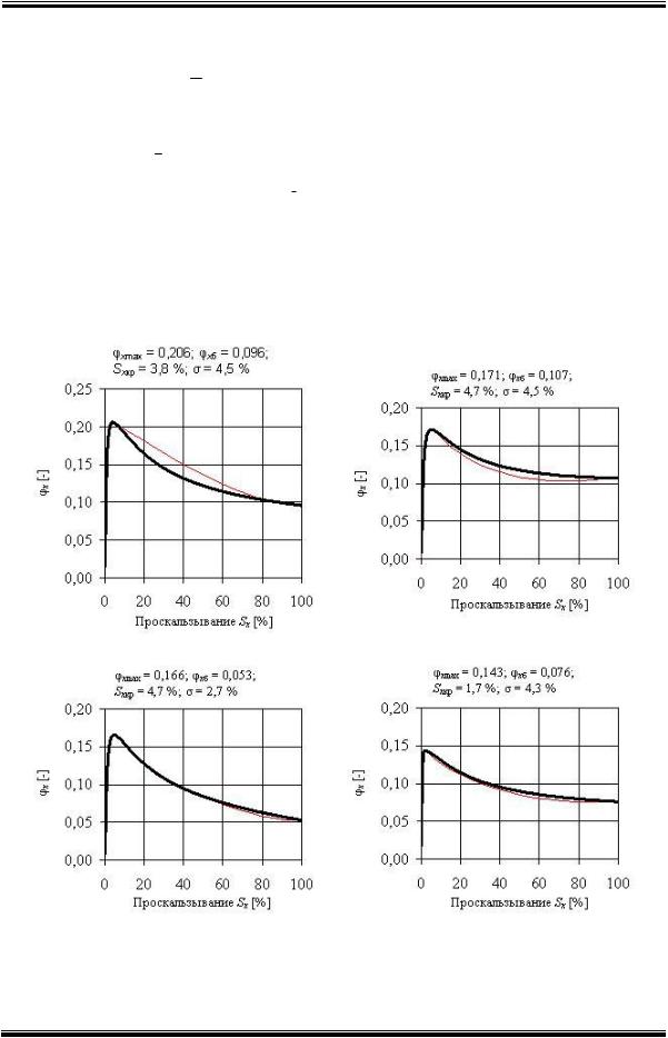 Используем экспериментальные данные, полученные в лаборатории испытаний шин СибАДИ на покрытии из натурального льда [2]. Объектами испытаний являлись легковые шины размером R14, R15 и R16. Условия испытаний варьировались в диапазонах: температура льда – -2,5…-7,5 °C; темп торможения колеса по тормозному моменту – 15 … 65 Н·м/c, скорость качения колеса – 25 … 75 км/ч, нагрузка Pz – от –50 % до +50 % от экономичной нагрузки. Толщина покрытия составляла 0,8…1,6 мм. По каждому испытанию получали массив, состоящий из 200 … 300 значений реакции Rx, нагрузки Pz и проскальзывания Sx. Изображаем на одном графике (рисунок 1) математически сглаженные нормированные характеристики ξx(Sx).