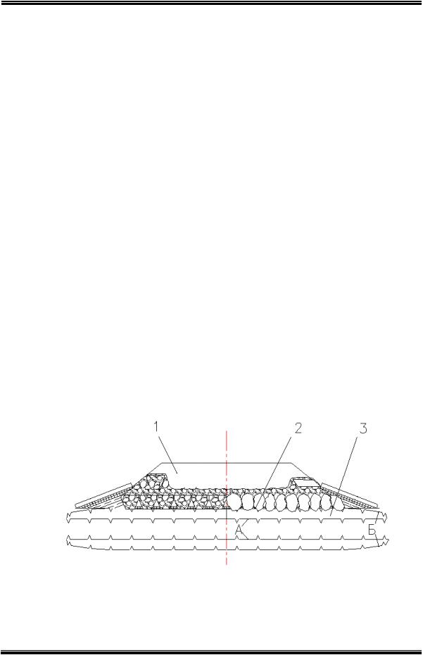 Рис. 1. Земляное сооружение: 1 – грунтовая насыпь; 2 – слой водонасышенного водоудерживающего материала (грунта, диода); 3 – поверхность многолетнемерзлого грунтового основания; А – положение высокотемпературной (неустойчивой) вечной мерзлоты до возведения земляного полотна; Б – положение высокотемпературной (неустойчивой)