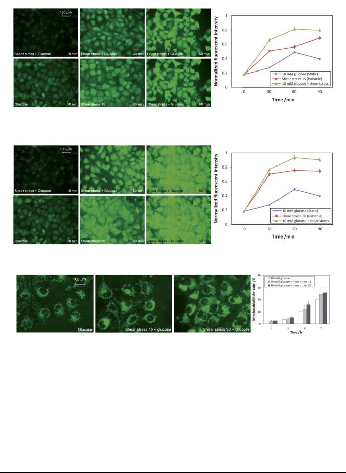elevated from 20% to 25% and 26%, respectively. The results show that the chemical treatment (i.e. high concentration of glucose) produced a more dominant effect in promoting mitochondrial fission than the physical treatment (i.e. pulsatile shear stress), especially in such an extreme case of 20 mM of glucose.