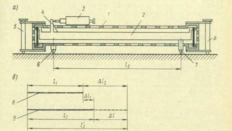 контроля состоит из: трубчатого корпуса, внутри которого расположен подвижный стержень, закрепленный с помощью плоских пружин, двух конических опорных ножек для опирания прибора; индикатора и двух ручек для переноски прибора. Подвижный стержень выполнен из сплава железа и никеля и обладает малым коэффициентом линейного расш рен я.