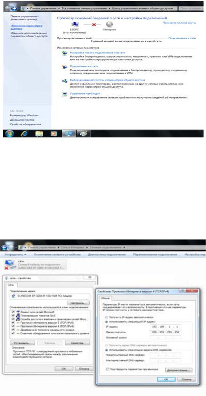 9. Далее зайдите на компьютере А в Пуск->Панель управле- ния->Центр управления сетями и общим доступом. В левой части экрана нажмите на ссылку Изменение параметров адаптера.