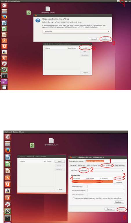 Пропишите IP-адрес компьютеру Б. Нажмите в верхнем правом углу на значок подключений, затем нажмите на строчку “Edit Сonnections”. В появившейся таблице нажмите на “Add”. В следующей таблице задйте тип подключения. В системе Ubuntu по умолчанию настроен Ethernet, поэтому просто нажмите кнопку “Create”.
