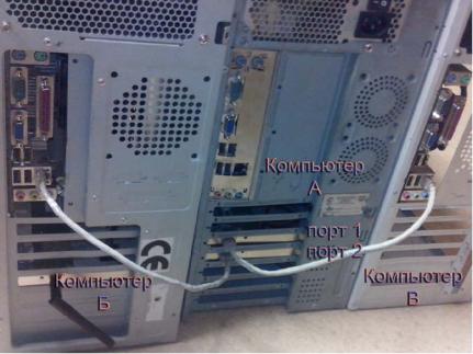 1. Возьмите 2 готовых патч-корда, обжатых по стандарту кросс-овер и выполните соединение трех компьютеров (рис.1).
