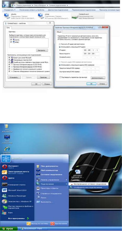 Следующим шагом будет настройка компьютера Б. Пропишите IP-адрес компьютеру Б. Для этого зайдите в Пуск->Сетевые подклю- чения->Отобразить все подключения.