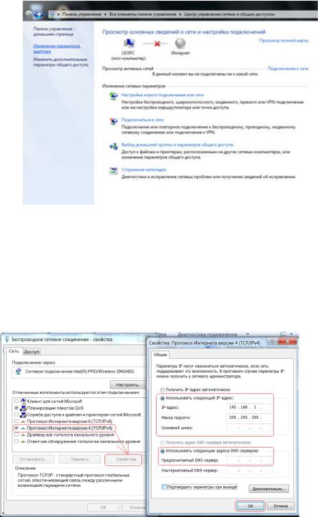 На коммутаторе должно загореться 4 световых индикатора. Далее поочередно настройте сетевые интерфейсы компьютеров. Приступите к настройке сетевых интерфейсов на компьютере А. Зайдите на компьютере А в Пуск->Панель управления->Центр управления сетями и общим доступом. В левой части экрана нажмите на изменение параметров адаптера (рис.2).