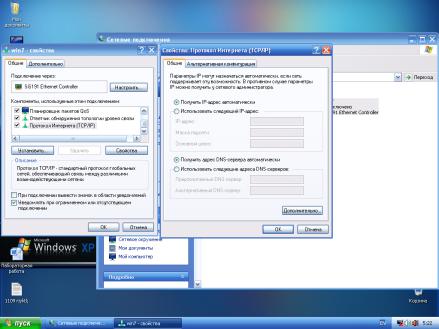 Кликните правой кнопкой мыши на вкладку Сетевое подключению (в нашем случае WinХР). В контекстном меню выберите свойства. Далее нажмите левой кнопкой мыши на вкладку «протокол версии 4(TCP/IPV4). Поставьте галочку на вкладку «Получить IP-адрес автоматически».