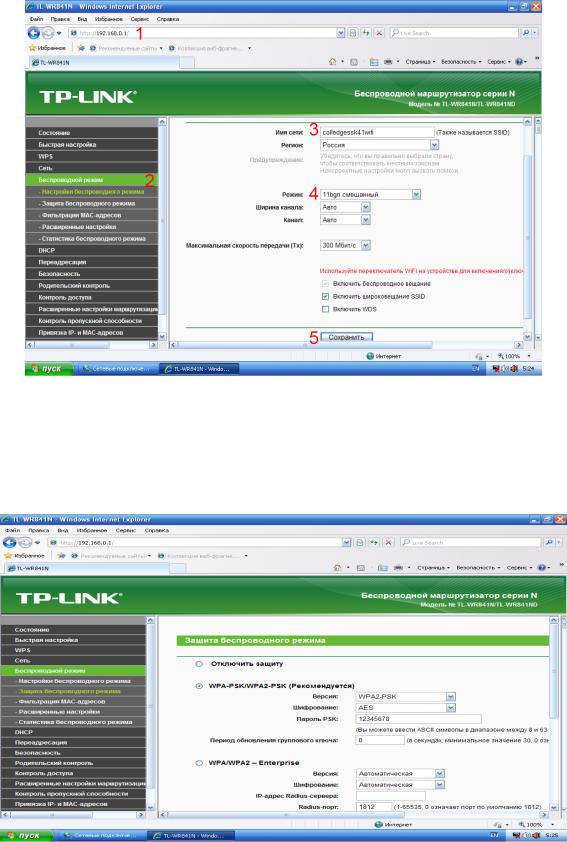 Зайдите в браузер “Интернет Explorer” c помощью ярлыка на рабочем столе. В адресной строке браузера введите адрес 192.168.0.1 и нажмите Enter. Выберите вкладку «Беспроводной режим». В появившемся окне задайте имя сети, например «colledgessk41wifi». В поле режим выставите протокол 11bgn cмешанный и нажмите кнопку сохранить.