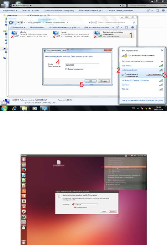 Нажмите на «Беспроводное сетевое соединение». В появившемся окне подключений выберите нашу сеть и нажмите кнопку Подключение. Введите ключ безопасности и нажмите кнопку Ок. Сеть подключена.