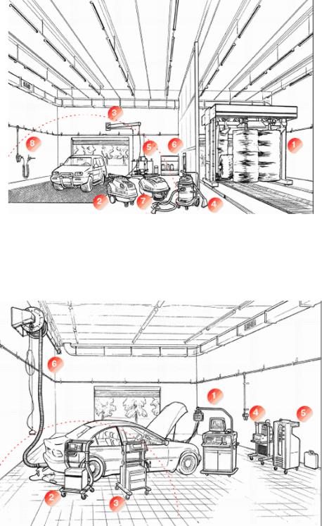 1 – автоматическая портальная мойка; 2 – моечная установка высокого давления; 3 –вращающаяся консоль для шланга; 4 – пылесос для влажной уборки; 5 – очистные сооружения; 6 – моющие средства; 7 – полоуборочная машина; 8 – продувочный пистолет